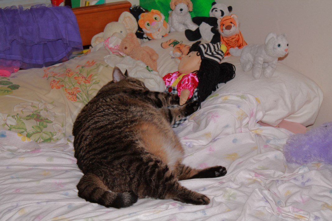 All curled up on our daughters bed, with her favourite doll...